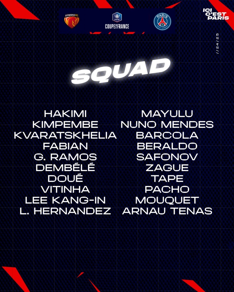 2月4日訊 北京時間明天凌晨,巴黎將在法國杯1/8決賽中對陣勒芒,巴黎公布了此役的球員名單,登貝萊、克瓦拉茨赫利亞在列,馬爾基尼奧斯、若昂-內維斯、扎伊爾-埃梅里缺席。