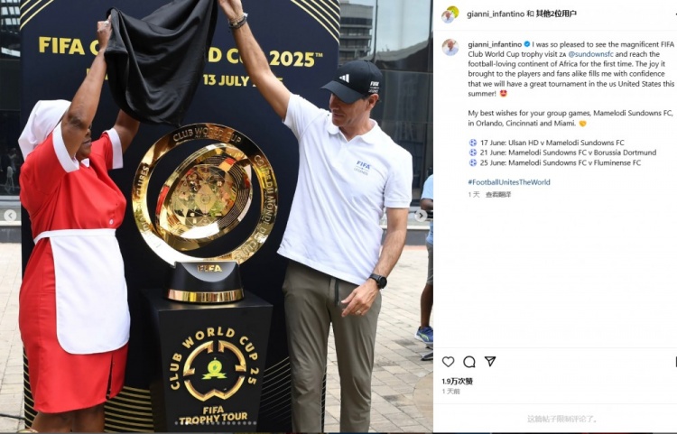 因凡蒂諾表示道:“我很高興看到這尊壯觀的世俱杯獎杯造訪馬梅洛迪日落俱樂部,并首次抵達熱愛足球的非洲大陸。