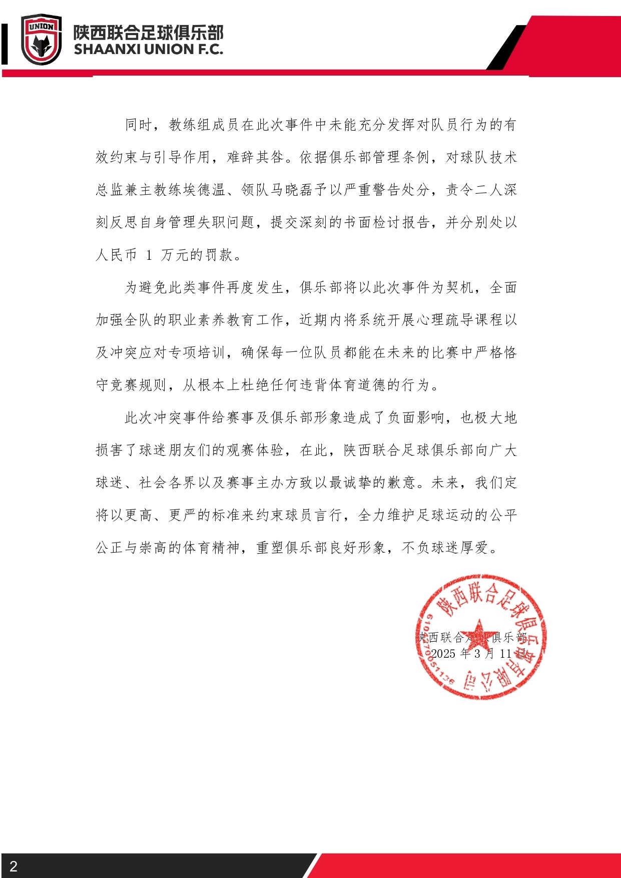 此次沖突事件給賽事及俱樂部形象造成了負面影響,也極大地損害了球迷朋友們的觀賽體驗,在此,陜西聯(lián)合足球俱樂部向廣大球迷、社會各界以及賽事主辦方致以最誠摯的歉意。未來,我們定將以更高、更嚴的標準來約束球員言行,全力維護足球運動的公平公正與崇高的體育精神,重塑俱樂部良好形象,不負球迷厚愛。