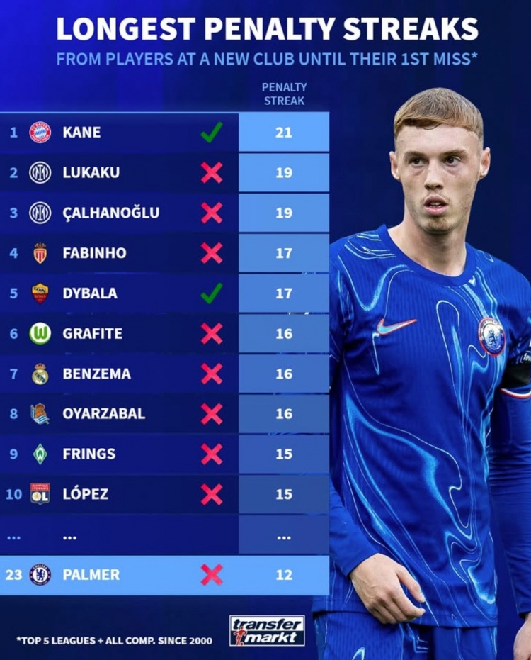 《轉(zhuǎn)會(huì)市場(chǎng)》統(tǒng)計(jì)了新世紀(jì)以來五大聯(lián)賽球員在新東家在不罰丟情況下連續(xù)命中點(diǎn)球紀(jì)錄,凱恩21球居首并且仍未罰丟。