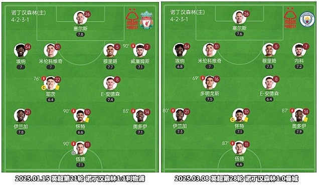 憑借赫德森-奧多伊的精彩進(jìn)球,諾丁漢森林主場擊敗曼城,從直接競爭對手那里奪得了價值連城的“六分”,在Big6球隊(duì)身上拿分已經(jīng)成為這支球隊(duì)的常規(guī)操作。聯(lián)賽上半程,諾丁漢森林主場送給利物浦賽季唯一敗仗,客場戰(zhàn)平切爾西,從狀態(tài)不佳的曼聯(lián)和熱刺那里賺足6分,踢到第17輪時所取得積分便已經(jīng)超過了上賽季的分?jǐn)?shù)(32分)。