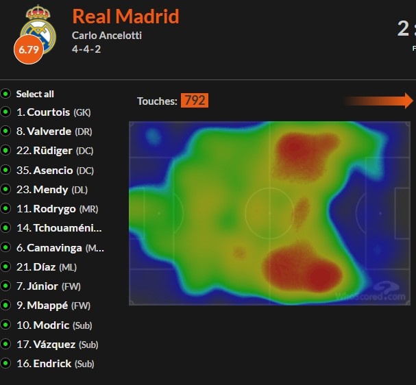 可以想到,因為在缺少大中鋒的情況下,他們不可能按照過去有中鋒時(哪怕是何塞-盧)那樣的傳中、搶點、后排套上爭搶機(jī)會模式來打了。維尼修斯、羅德里戈、包括姆巴佩都是在突擊方面遠(yuǎn)勝過被迫的站樁方面效率選手,因此,他們也會自主扯到邊路來踢球。