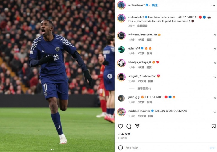 登貝萊也在賽后通過社媒曬出自己的慶祝照,并配文:“真是一個(gè)美好的夜晚……巴黎加油?。?!???????? ???????? 沒有時(shí)間放松。讓我們繼續(xù)前進(jìn)吧!”