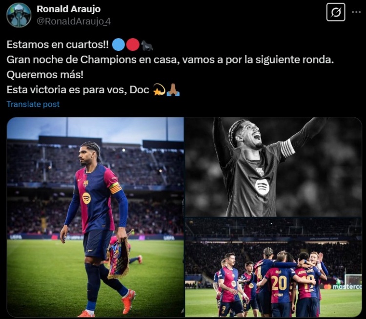 巴薩隊(duì)長(zhǎng)阿勞霍也在賽后社媒曬照,將勝利獻(xiàn)給球隊(duì)已故隊(duì)醫(yī),配文寫道:“我們晉級(jí)8強(qiáng),很棒的歐冠主場(chǎng)之夜,讓我們晉級(jí)下一輪!我們還想要更多。勝利獻(xiàn)給你,醫(yī)生。”