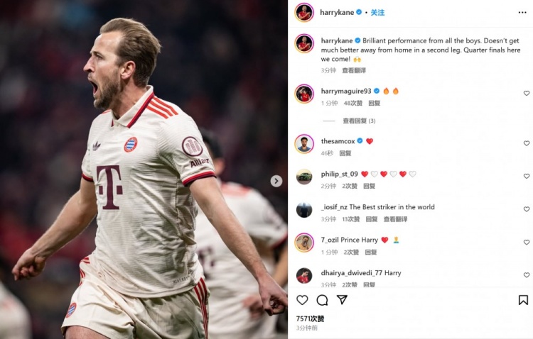 凱恩也在賽后通過(guò)社媒曬出自己的比賽照,并配文:“全隊(duì)交出精彩表現(xiàn),沒(méi)有比這更棒的客場(chǎng)次回合了。八強(qiáng)戰(zhàn)我們來(lái)了!”