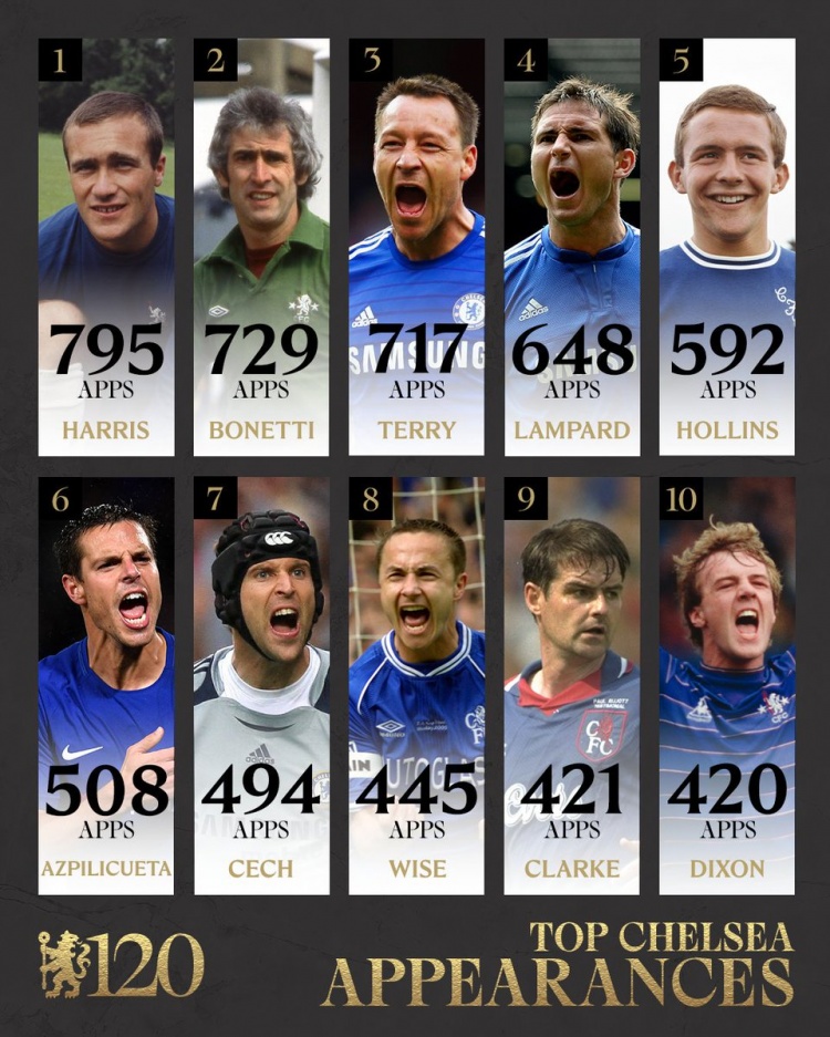 3月12日訊 切爾西俱樂(lè)部成立120周年,球隊(duì)官方社媒曬截至目前球員代表球隊(duì)出場(chǎng)次數(shù)榜,羅恩-哈里斯第一,特里第三,蘭帕德第四,AZP第六,切赫第七。