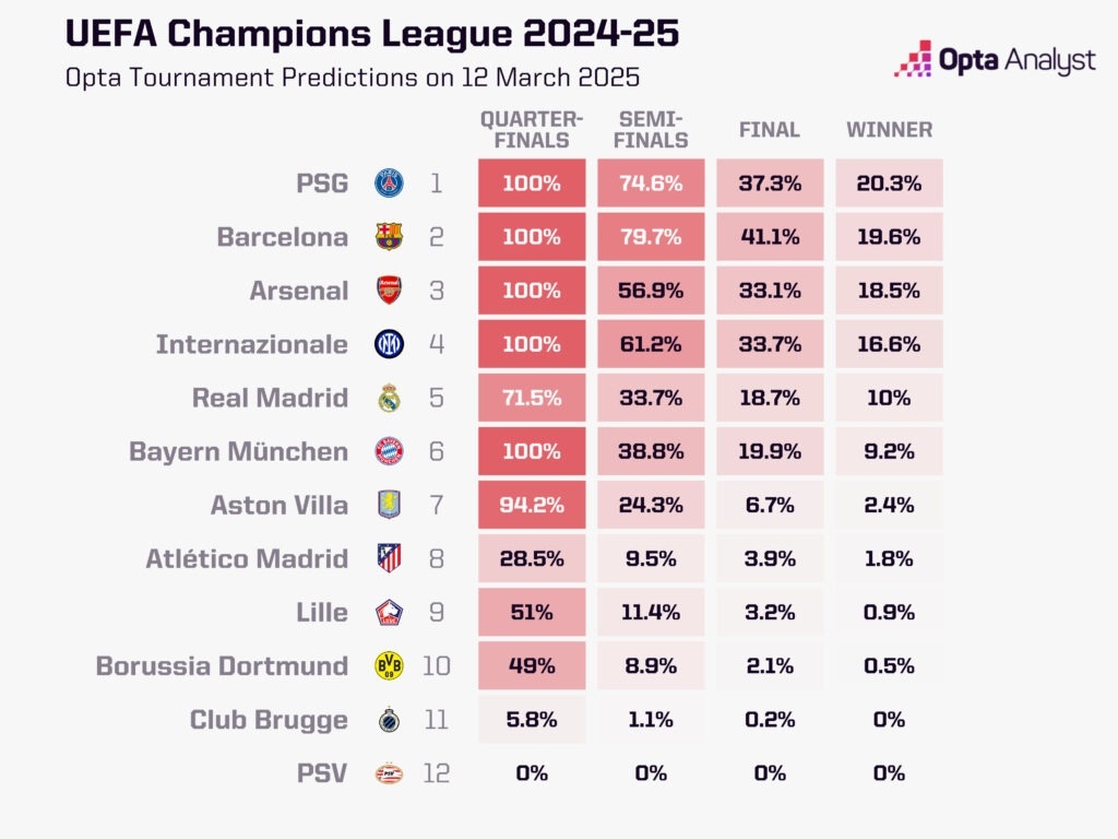 最大熱門出局!opta最新歐冠奪冠概率:巴黎第1 巴薩第2 皇馬第5