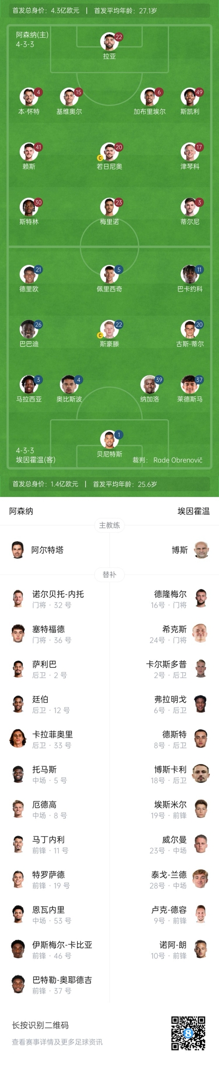 阿森納替補(bǔ):32-內(nèi)托、36-塞特福德、2-薩利巴、12-廷伯、33-卡拉菲奧里、5-托馬斯、8-厄德高、53-恩瓦內(nèi)里、11-馬丁內(nèi)利、19-特羅薩德、37-奧耶德吉、46-卡比亞