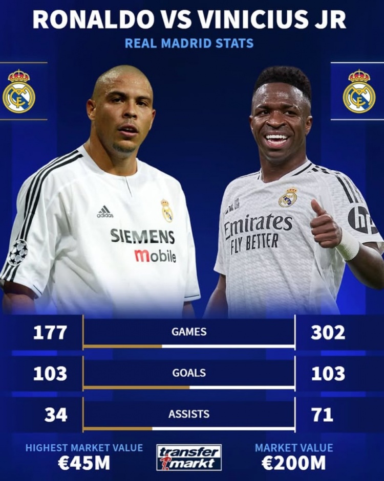羅納爾多為皇馬出戰(zhàn)177場(chǎng),貢獻(xiàn)103球34助攻,巔峰德轉(zhuǎn)身價(jià)4500萬歐。維尼修斯則在302場(chǎng)為皇馬貢獻(xiàn)103球71助攻,巔峰德轉(zhuǎn)身價(jià)2億歐。