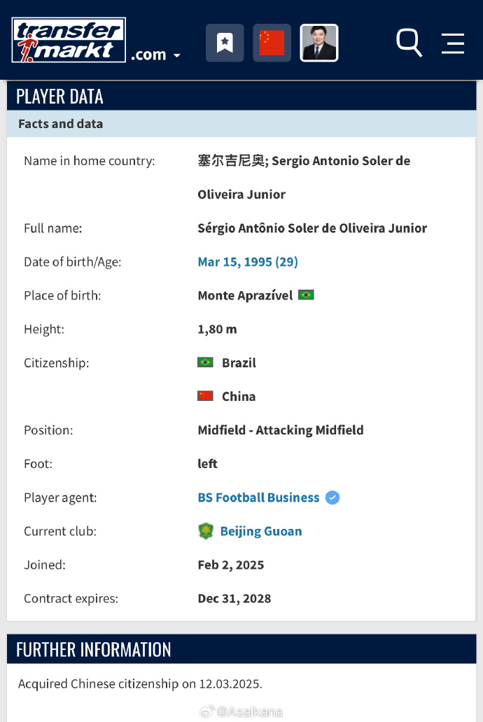 朱藝寫道:原籍巴西的北京國(guó)安球員塞爾吉尼奧已經(jīng)完成了中國(guó)入籍手續(xù),成為了一名中國(guó)公民。轉(zhuǎn)會(huì)市場(chǎng)網(wǎng)已經(jīng)根據(jù)相關(guān)情況,將中國(guó)國(guó)旗添加到了他的資料中。待他上演中國(guó)國(guó)家隊(duì)首秀時(shí),我們將會(huì)把他的“第一會(huì)籍”改為中國(guó)。