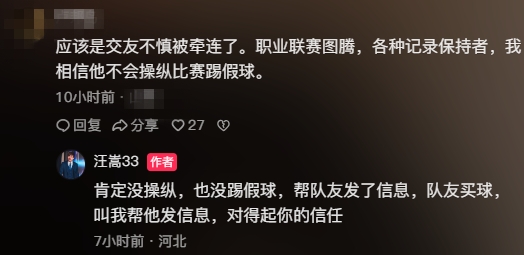 網(wǎng)友:應該是交友不慎被牽連了。職業(yè)聯(lián)賽圖騰,各種記錄保持者,我相信他不會操縱比賽踢假球。