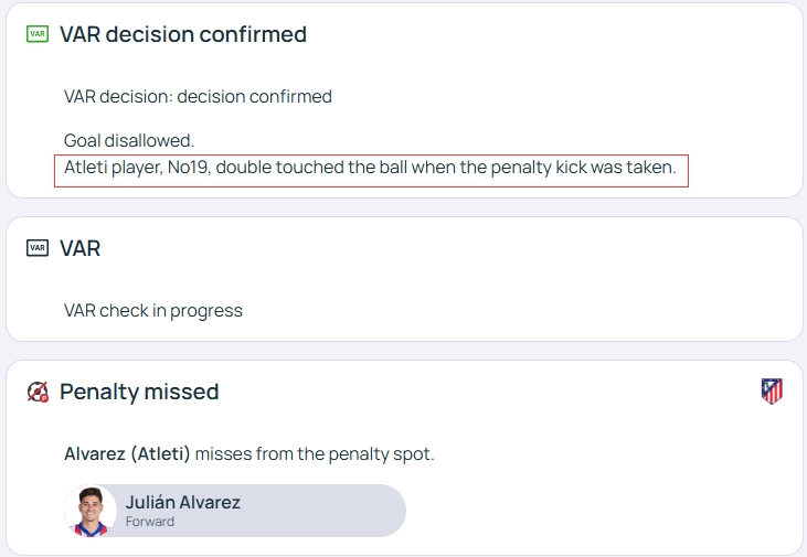 歐冠官網(wǎng)對此的解釋為:VAR判決確定,進(jìn)球無效。馬競19號球員(阿爾瓦雷斯),罰點(diǎn)時(shí)兩次觸球。