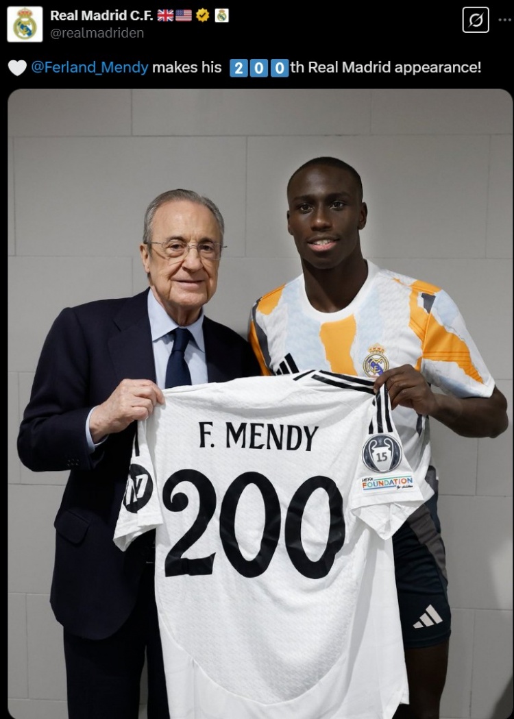 本場(chǎng)比賽也是門迪代表皇馬各項(xiàng)賽事第200次出場(chǎng),球隊(duì)官方也曬出門迪與主席弗洛倫蒂諾的合照,祝賀他達(dá)成這一里程碑。