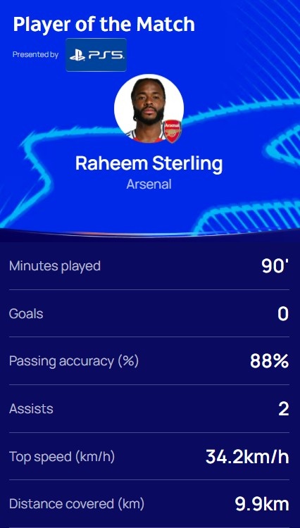 本場(chǎng)比賽斯特林表現(xiàn)不俗,雖然沒(méi)能把握進(jìn)球良機(jī),但是送出2次助攻,傳球成功率88%,跑動(dòng)距離9.9km,賽后也當(dāng)選歐冠官方評(píng)選出的本場(chǎng)最佳球員。