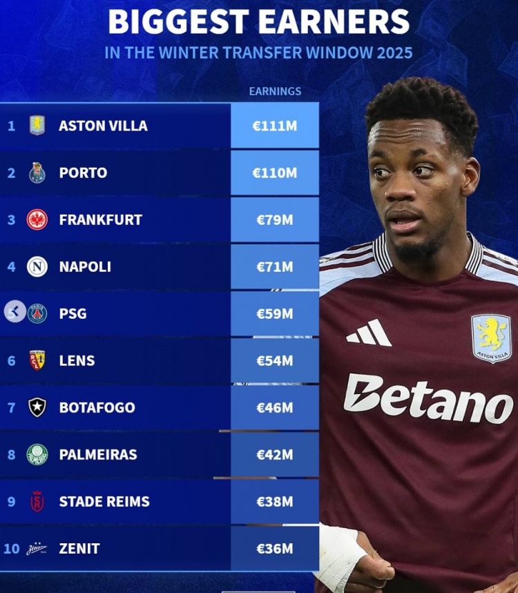 2月5日訊 五大聯(lián)賽已經(jīng)關(guān)窗,《轉(zhuǎn)會(huì)市場(chǎng)》也統(tǒng)計(jì)了今年冬窗各隊(duì)收入情況,維拉力壓波爾圖居首。