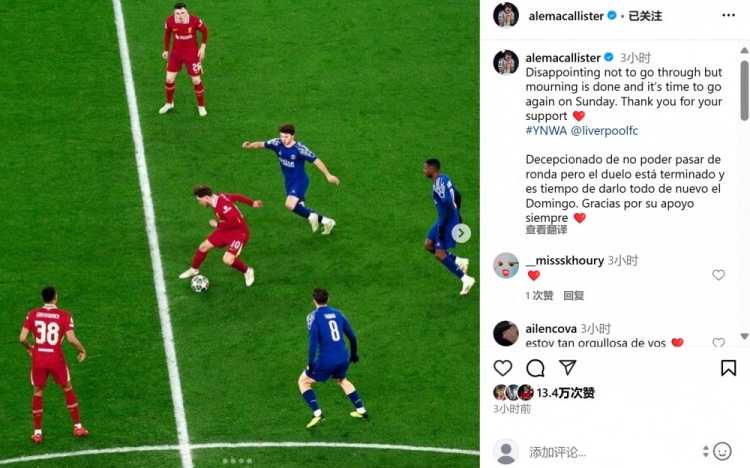 麥卡利斯特在社媒曬出一張面對巴黎3人合圍的照片,配文寫道:“很失望未能更進一步,但是該停止遺憾了,是時候在周末再次出發(fā)。感謝大家的支持?!?/p>