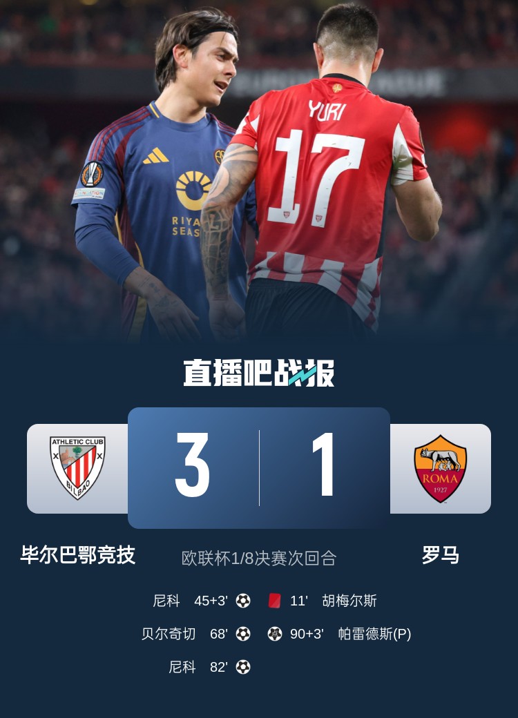 歐聯(lián)16強次回合,羅馬1-3不敵畢巴,羅馬總比分3-4遭逆轉。胡梅爾斯11分鐘染紅。