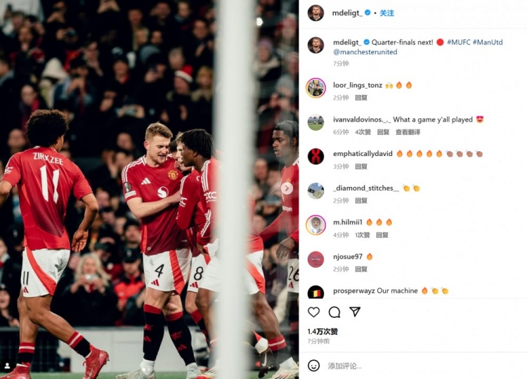 德里赫特也在賽后曬出和隊(duì)友的慶祝照,并配文:“下一站八強(qiáng)!@曼聯(lián)俱樂(lè)部。”