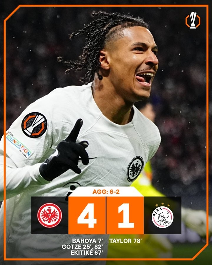 3月14日訊 法蘭克福在本輪歐聯(lián)杯主場4-1大勝阿賈克斯,兩回合總比分6-2雙殺對手。
