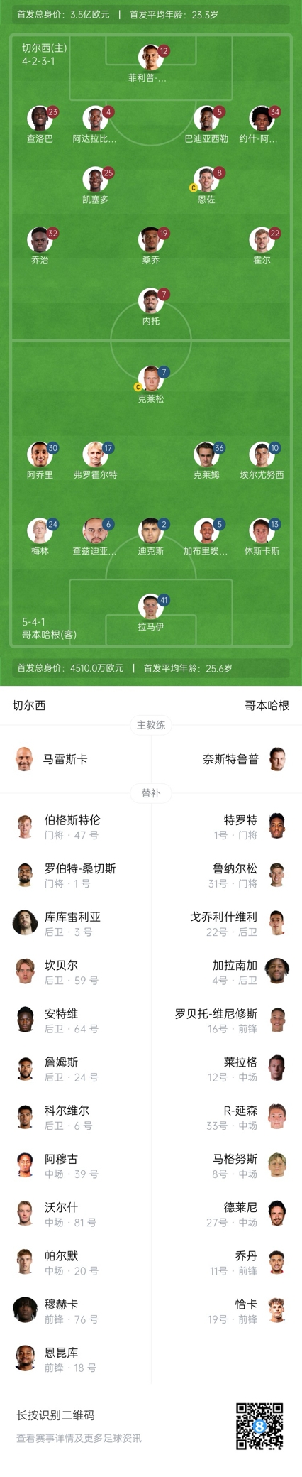 切爾西首發(fā):12-約根森、34-阿奇姆彭、23-查洛巴、4-阿達拉比奧尤、5-巴迪亞西勒、25-凱塞多、8-恩佐-費爾南德斯、32-喬治、22-霍爾、19-桑喬、7-內托