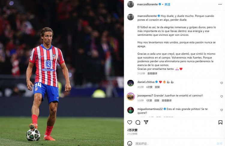 3月14日訊 馬競在本輪歐冠主場被皇馬點球淘汰,出自皇馬青訓(xùn)的馬科斯-略倫特罰丟點球,他也在今日通過社媒發(fā)文。