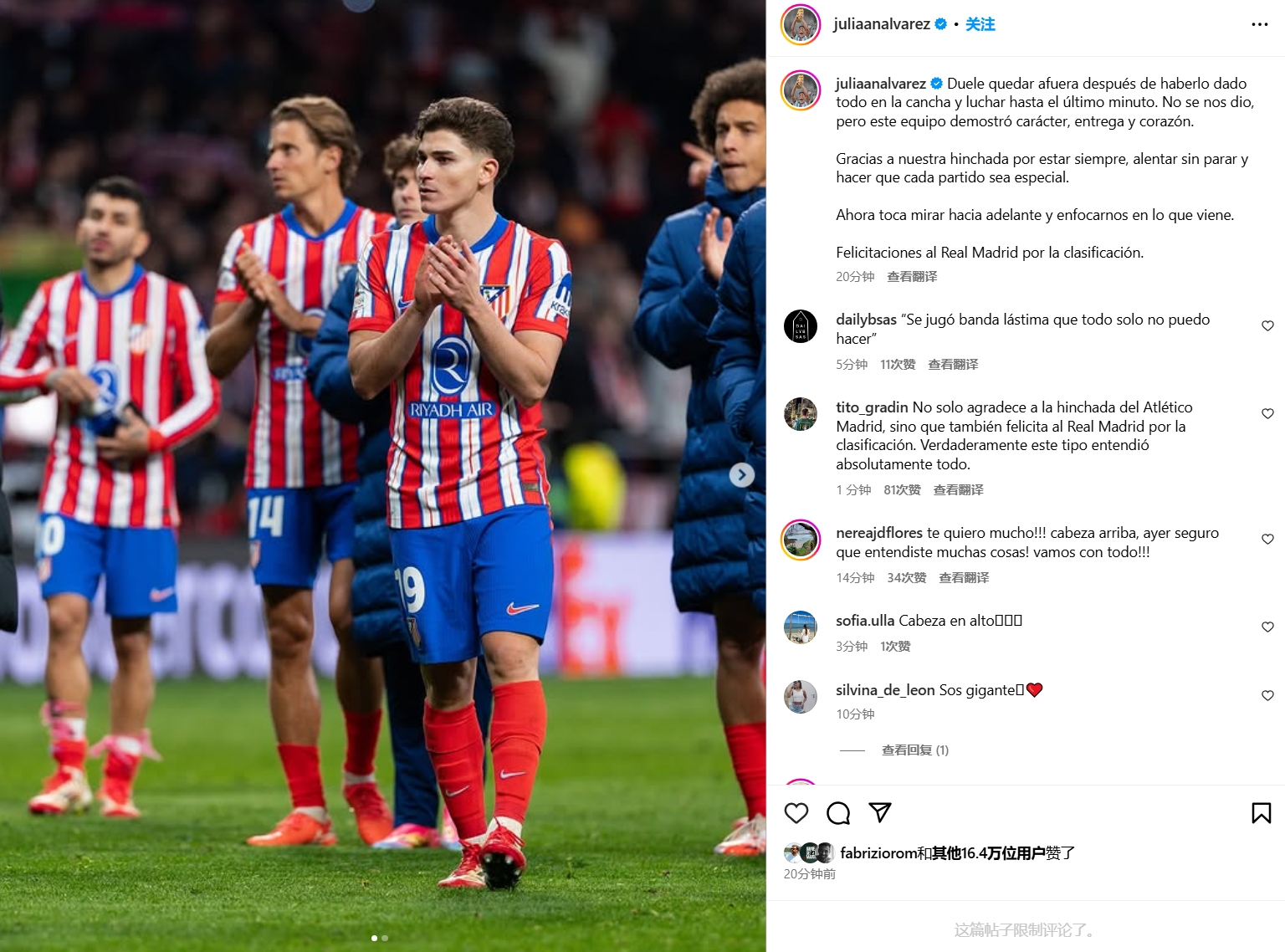 03月14日訊 歐冠16強(qiáng)對(duì)決,馬競(jìng)在點(diǎn)球戰(zhàn)不敵皇馬,阿爾瓦雷斯點(diǎn)球戰(zhàn)點(diǎn)球罰進(jìn)但因二次觸球被判無效。阿爾瓦雷斯如今在社媒發(fā)文談到感想。