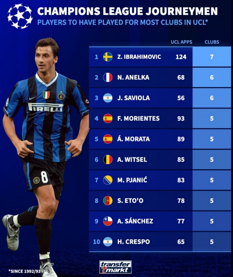 3月14日訊 轉(zhuǎn)會(huì)市場(chǎng)盤點(diǎn)了歐冠改制以來,球員代表最多不同球隊(duì)參賽次數(shù)榜,伊布共代表7支球隊(duì)參賽居首,具體如下: