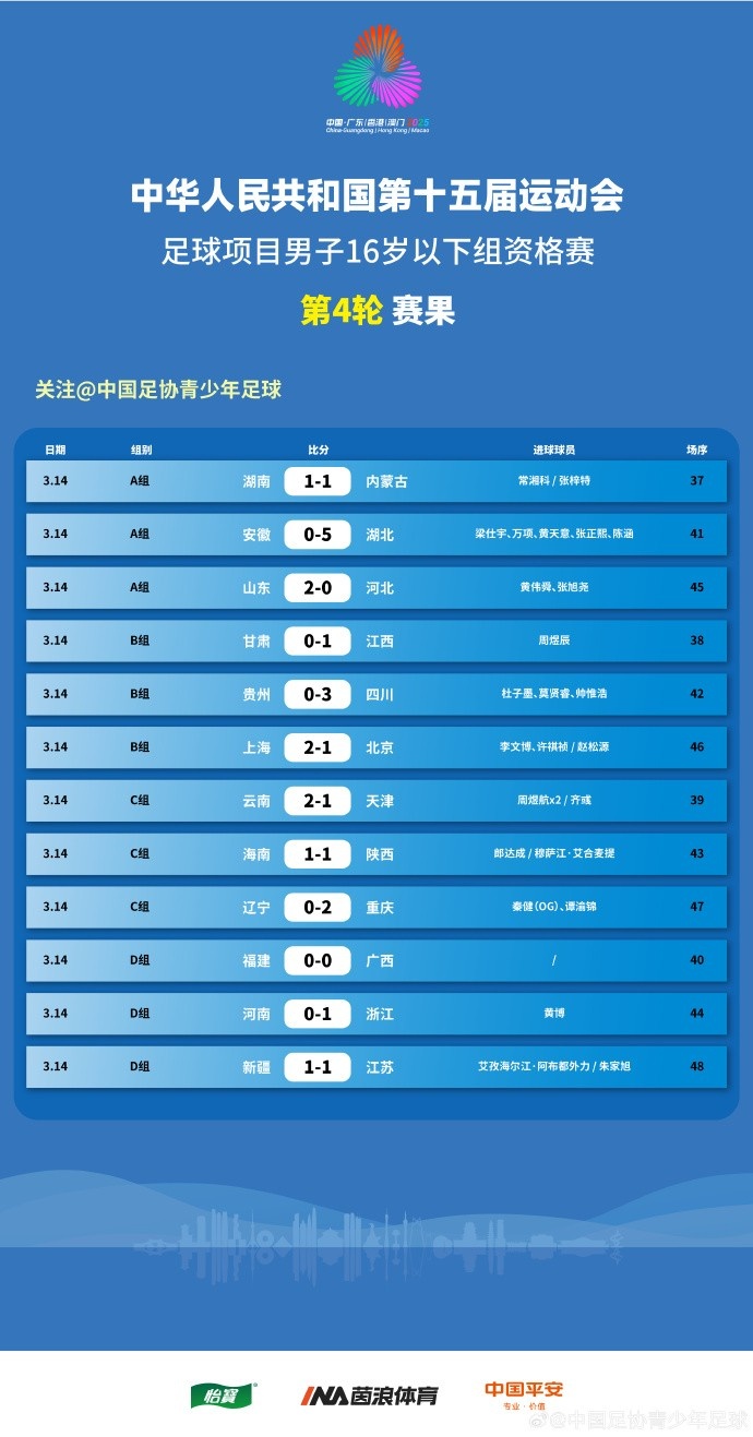 第十五屆運(yùn)動(dòng)會(huì)足球項(xiàng)目男子16歲以下組資格賽第4輪賽果