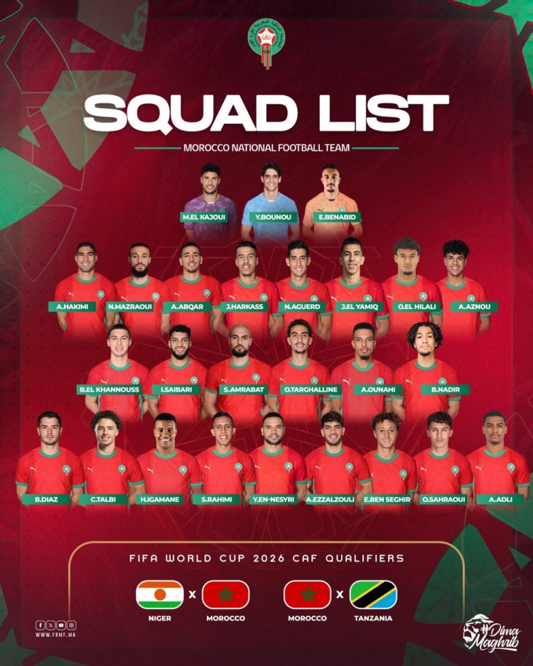 3月14日訊 摩洛哥公布最新一期國家隊名單,阿什拉夫、馬茲拉維、布拉欣-迪亞斯、恩-內斯里、阿姆拉巴特等球員入選。