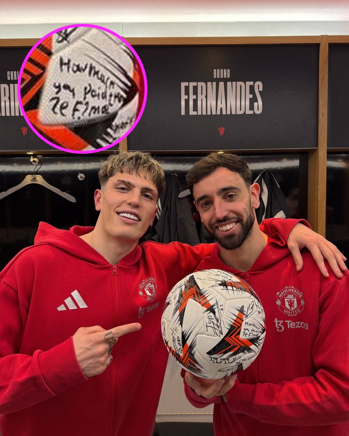 據(jù)報道,B費在賽后帶走了比賽用球,并在更衣室內讓隊友在球上簽名留言,很多隊友都在足球上寫下了祝賀的話語,但有一人在足球上字跡潦草地寫著:你付給裁判多少錢?(how much you paid the ref)。
