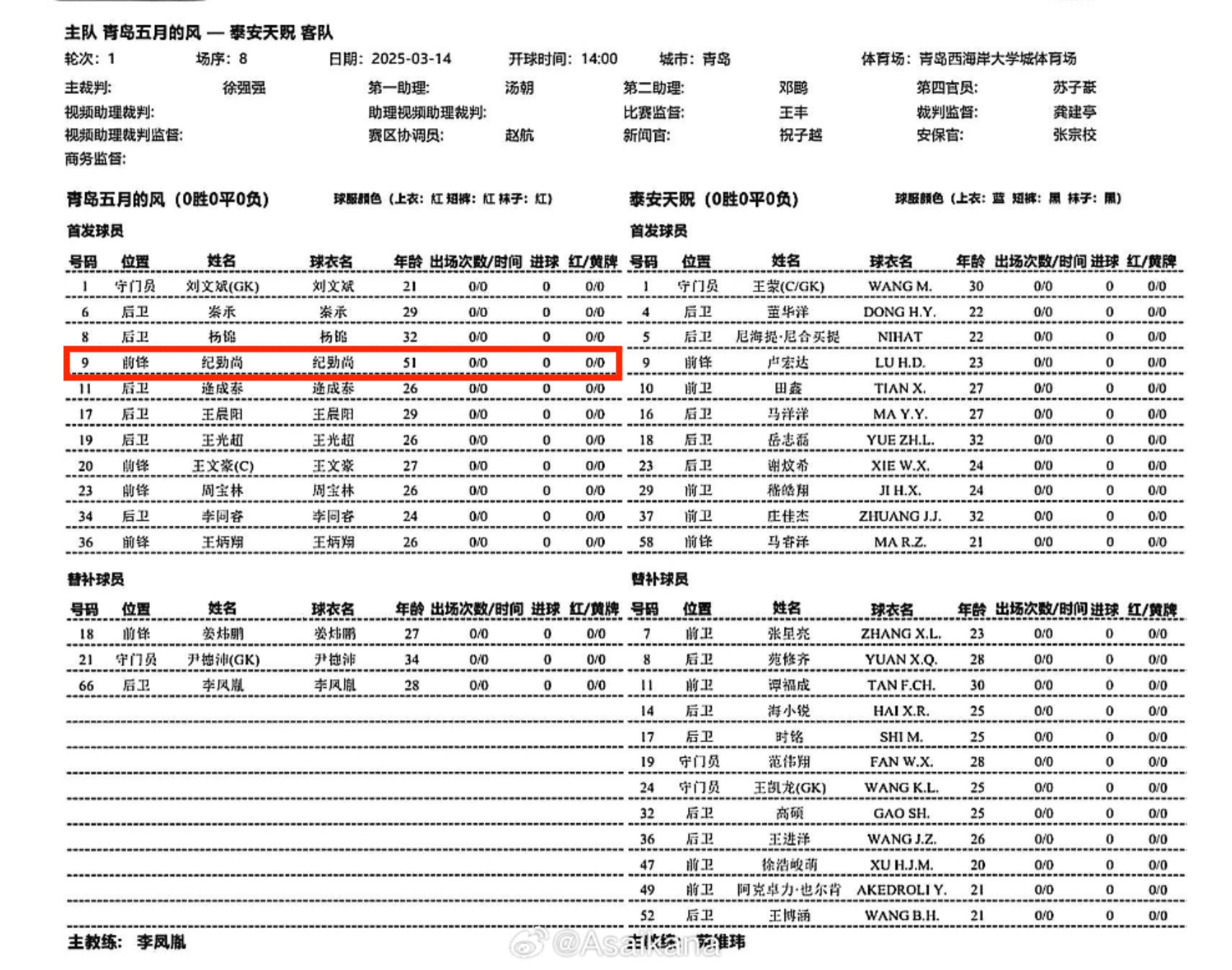 中冠球隊青島五月的風(fēng)將對陣中乙球隊泰安天貺。根據(jù)首發(fā)名單,青島五月的風(fēng)投資人、51歲的紀勤尚將先發(fā)出戰(zhàn),擔任前鋒。 ???