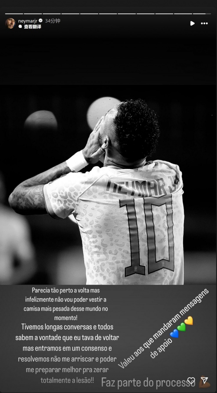 內(nèi)馬爾寫道:“看似回歸近在咫尺,但遺憾的是,目前我還無法穿上這件世界上最具分量的球衣!我們進行了長時間的交談,大家都知道我渴望回歸的心情,但我們(在溝通后)達成了共識,決定不冒險,而是更好地做好準(zhǔn)備,等傷病完全痊愈!這是整個過程的一部分???”