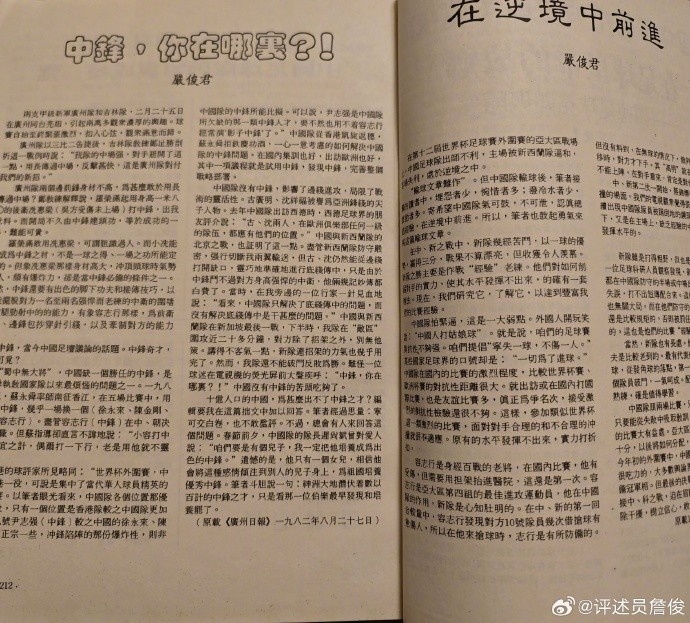 父親說,這些小薄紙片挺“解渴”的。那里肯定也有嚴俊君老總的“耕耘之作”。我開始工作后,和“足球報”很多同行成為好友,可惜那時嚴總已經退居二線,無緣相見。今晚得知他老人家駕鶴西去,心中惆悵。謝謝您!曾經帶我們這些球迷去“看世界”……