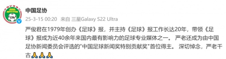 3月15日訊 《足球》報官方發(fā)布訃告,《足球》報創(chuàng)刊人嚴(yán)俊君因病離世,享年86歲。中國足協(xié)發(fā)文進(jìn)行悼念。