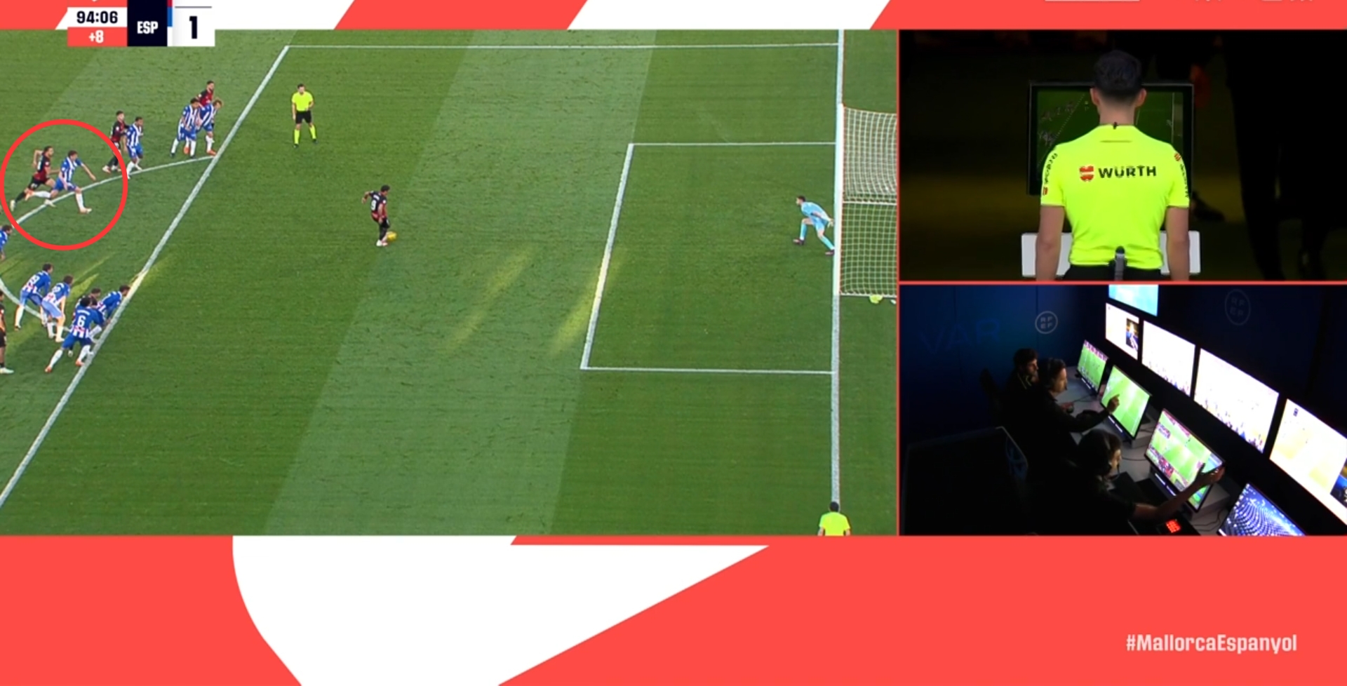 第72分鐘,主裁判罰西班牙人后衛(wèi)庫姆布拉禁區(qū)內手球,再度果斷判點,但在觀看回放后取消點球判罰↓