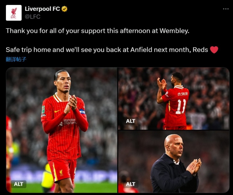 利物浦官推也在賽后感謝了球迷:“感謝你們今天下午在溫布利的支持。安全回家。紅軍們,我們下個(gè)月安菲爾德再見(jiàn)?!?/p>