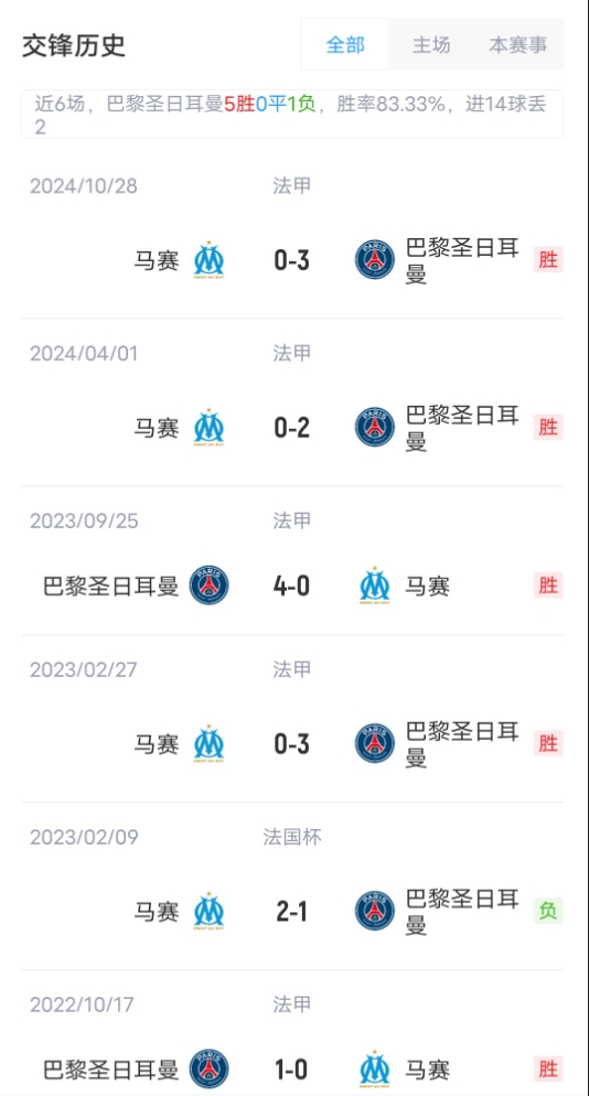 目前法甲聯(lián)賽巴黎取得了20勝5平的成績(jī),積65分高居聯(lián)賽榜首。馬賽取得了15勝4平6負(fù)的成績(jī),積49分位居聯(lián)賽第二。
