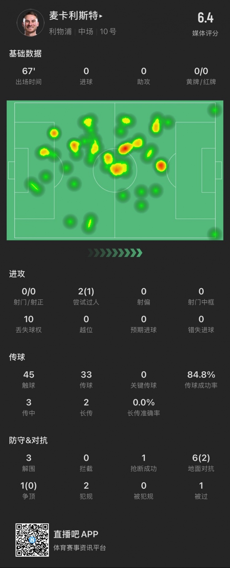 3月17日訊 本賽季聯(lián)賽杯決賽,利物浦對(duì)陣紐卡的比賽正在進(jìn)行。麥卡利斯特在第64分鐘被換下場(chǎng),目前只獲評(píng)6.4分。