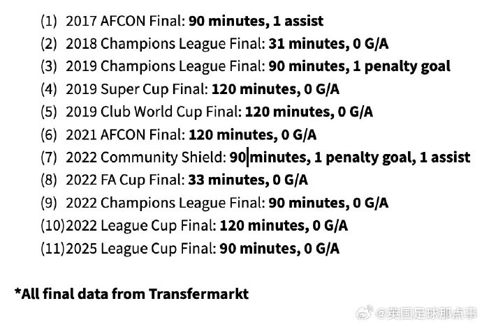 Transfermarkt:薩拉赫至今已代表俱樂部和國家隊參加了11場決賽,累計出場約1000分鐘,但從未打入非點(diǎn)球進(jìn)球。