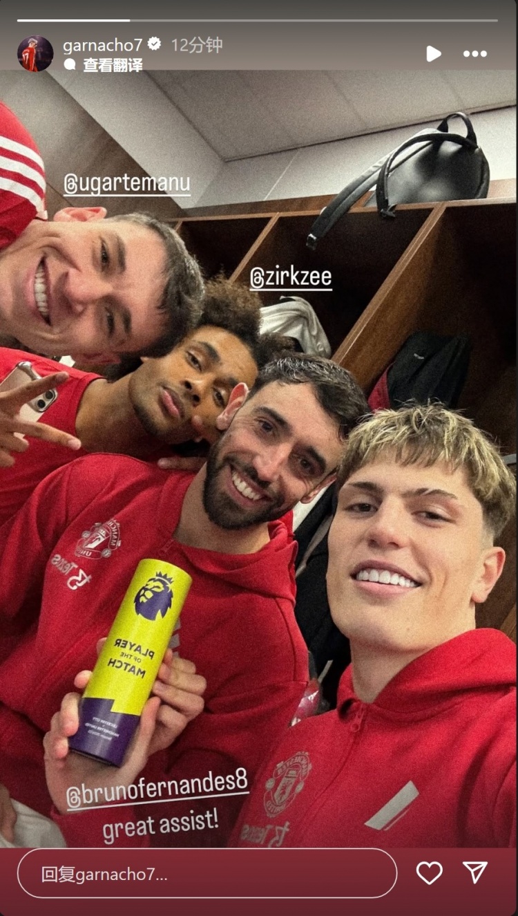 加納喬在社交媒體上曬出與B費(fèi)、齊爾克澤、烏加特賽后的更衣室合照,他手拿B費(fèi)的全場(chǎng)最佳獎(jiǎng)杯,配文:“很棒的助攻?!?/p>