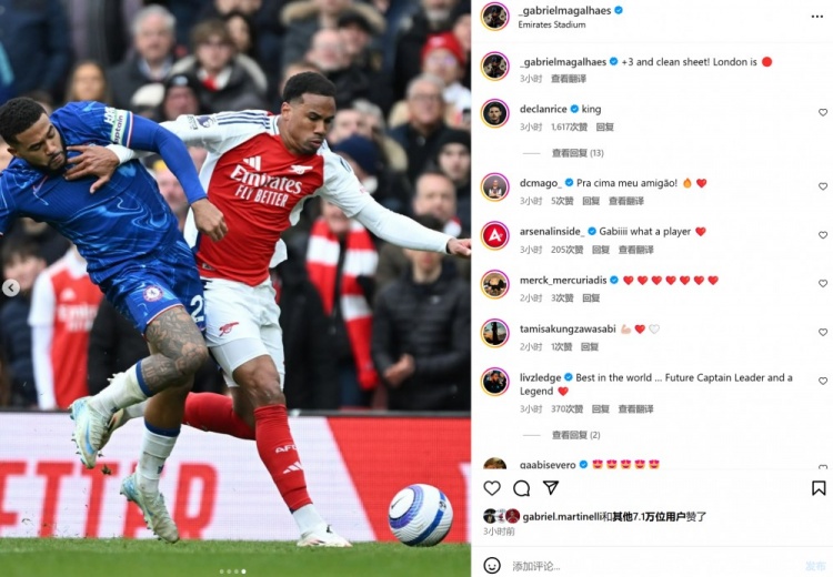 本場(chǎng)比賽加布里埃爾發(fā)揮出色,賽后當(dāng)選英超官方球迷票選全場(chǎng)最佳,賽后他也在社媒曬出本場(chǎng)與里斯-詹姆斯對(duì)抗照片,配文寫(xiě)道:“拿下三分并完成零封,倫敦是紅色的!”