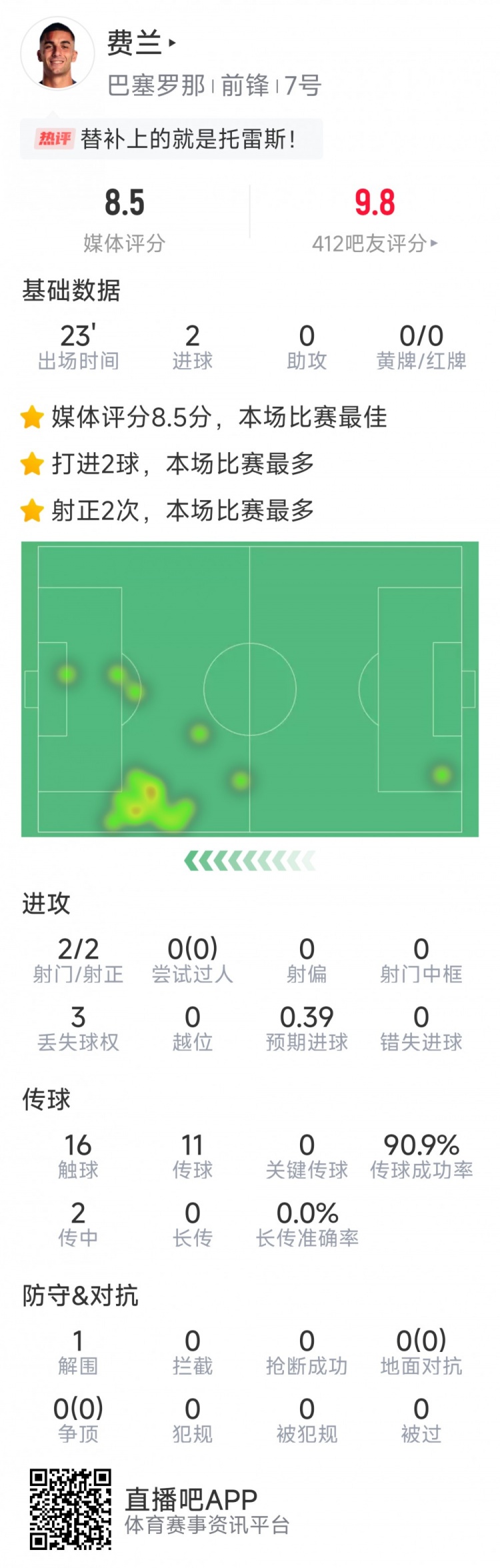 3月17日訊 在本輪西甲巴薩4-2擊敗馬競(jìng)的比賽中,費(fèi)蘭替補(bǔ)登場(chǎng)梅開(kāi)二度,以下為他在本場(chǎng)數(shù)據(jù):