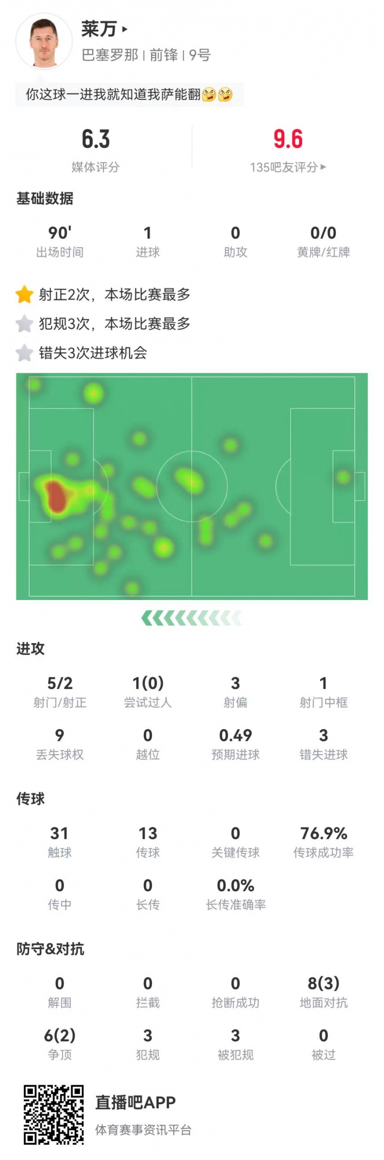 3月17日訊 巴薩在本輪西甲4-2逆轉(zhuǎn)馬競,萊萬本場數(shù)據(jù)如下: