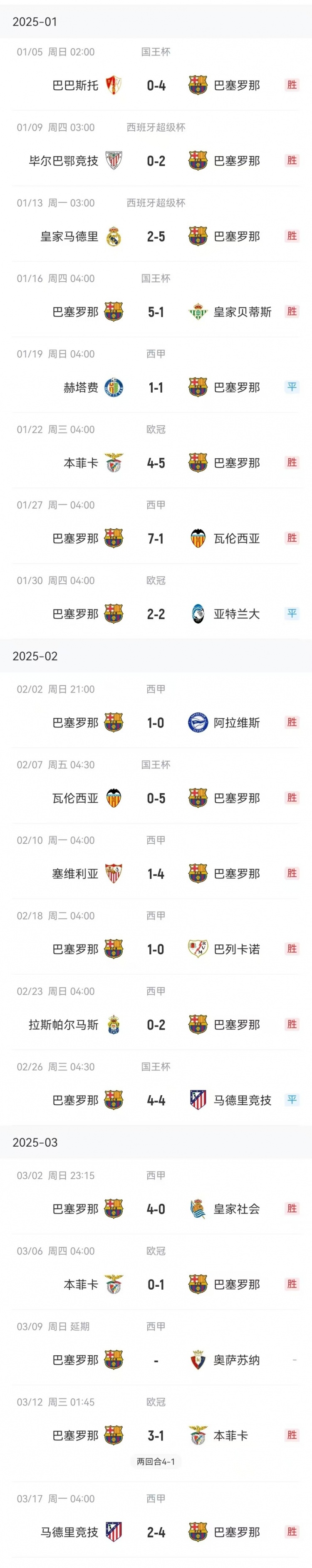 3月17日訊 巴薩在本輪西甲4-2逆轉馬競,延續(xù)了今年的不敗勢頭。數據統(tǒng)計顯示,自去年年底2連敗之后,巴薩進入2025年后各項賽事18場不敗。巴薩在此期間取得15勝3平,打進58球僅丟19球。 標簽: 足球 西甲 巴塞羅那 馬德里競技