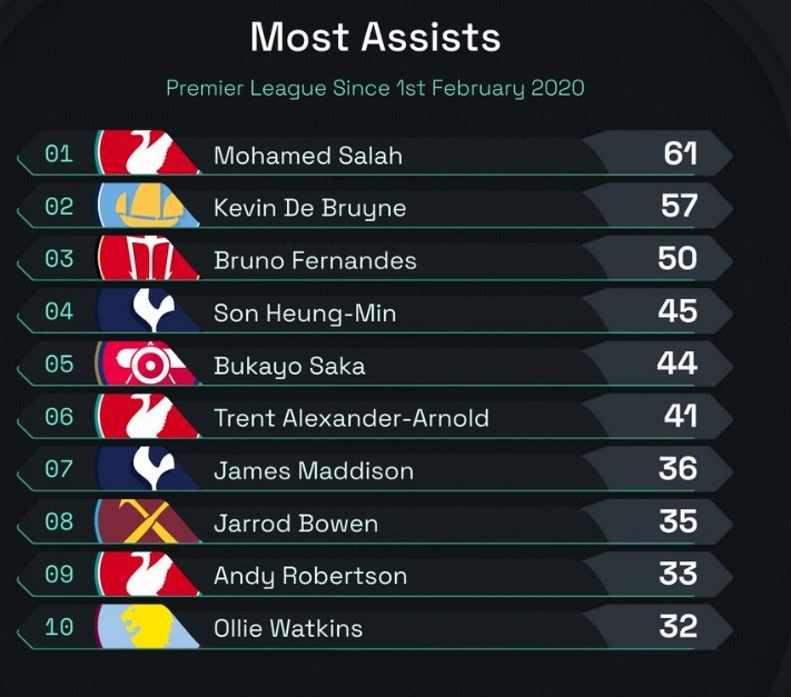 3月17日訊 在本輪英超曼聯(lián)3-0大勝萊斯特城的比賽中,B費(fèi)助攻雙響,個(gè)人英超助攻數(shù)達(dá)到50次。以下為自B費(fèi)2020年2月英超首秀以來英超同期助攻榜: