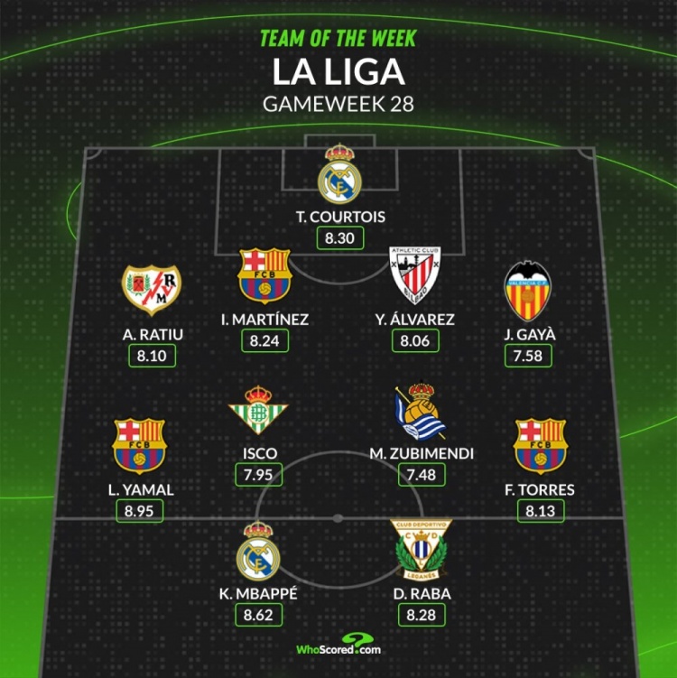 中場:亞馬爾(巴薩,8.95分)、伊斯科(貝蒂斯,7.95分)、祖比門迪(皇社,7.48分)、費(fèi)蘭(巴薩,8.13分)