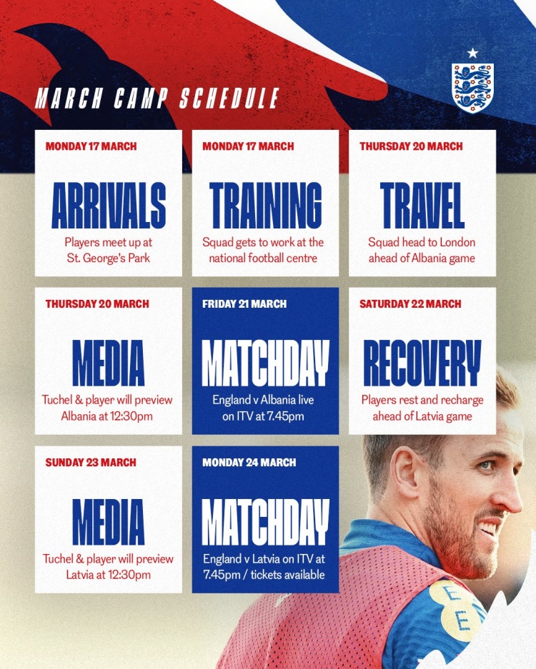 3月17日訊 英格蘭隊官方公布了今年首次集訓(xùn)的日程,三獅軍團(tuán)將在世預(yù)賽小組賽中對陣阿爾巴尼亞和拉脫維亞。