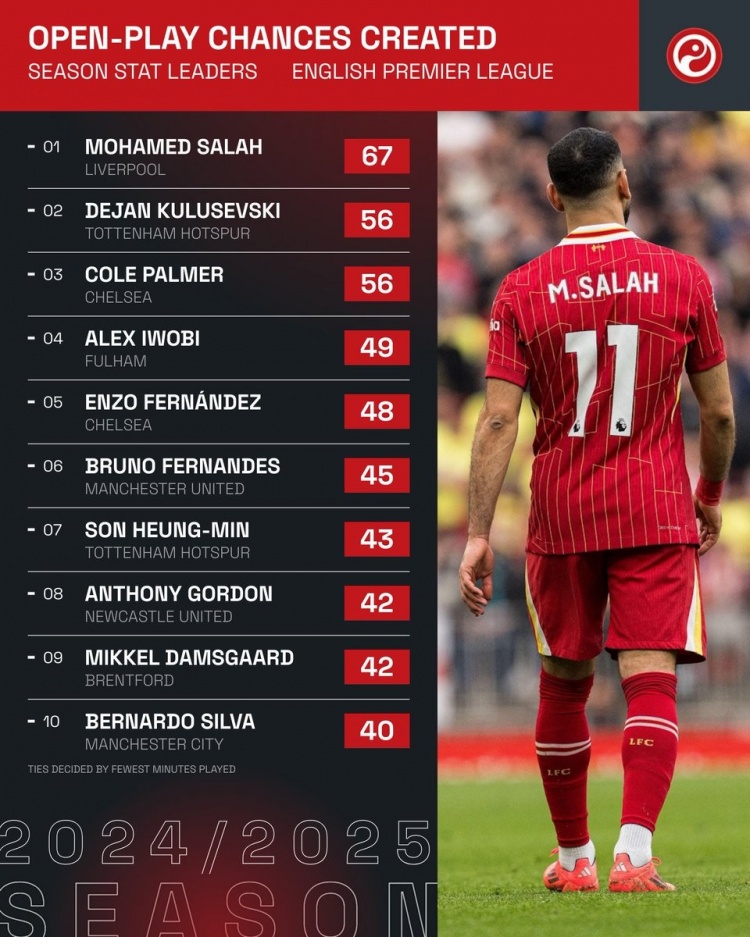 本賽季英超運(yùn)動(dòng)戰(zhàn)創(chuàng)造機(jī)會(huì)榜: