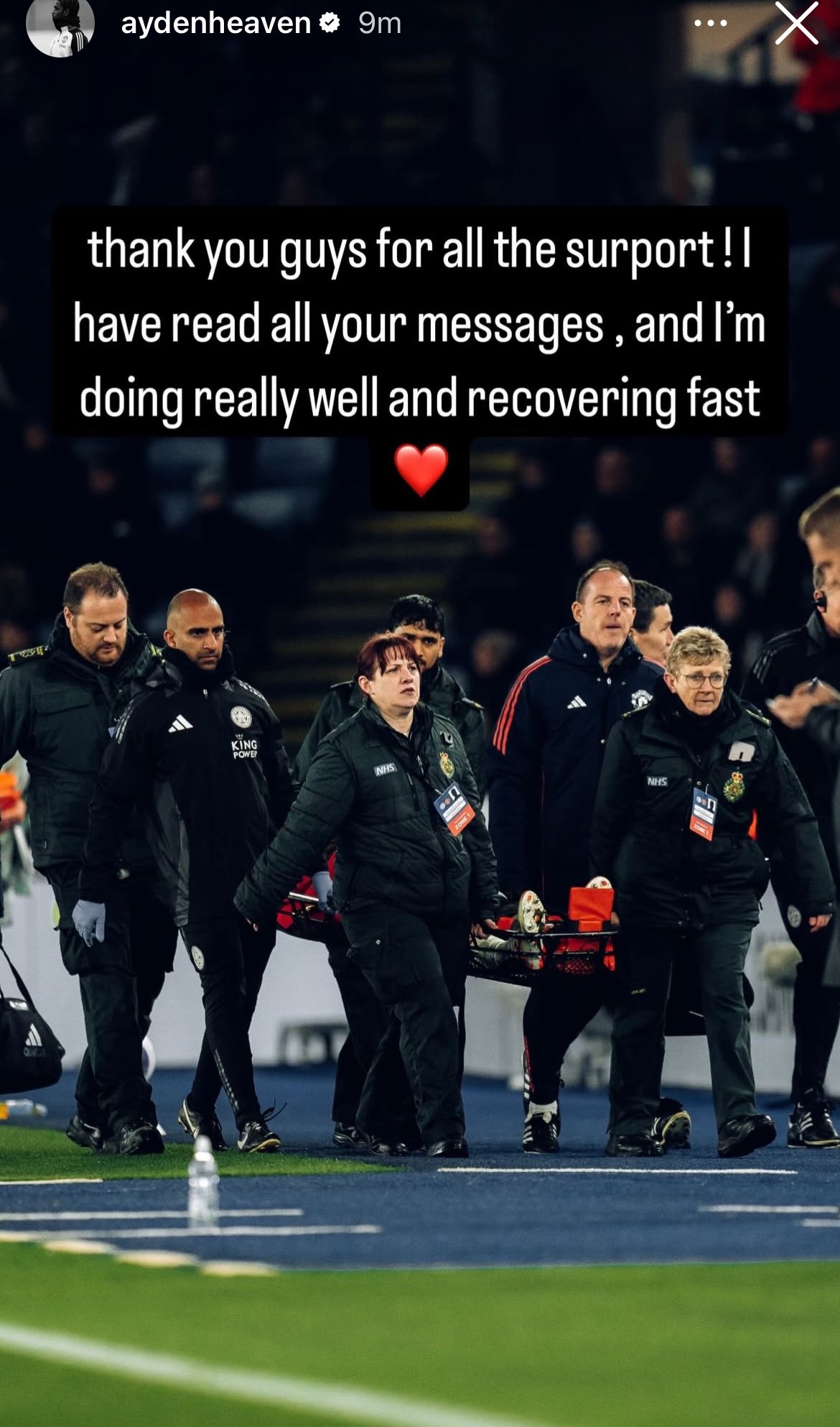 3月19日訊 曼聯(lián)在本輪英超3-0客勝萊斯特城,18歲中衛(wèi)海文首發(fā)因傷被擔架抬離球場。