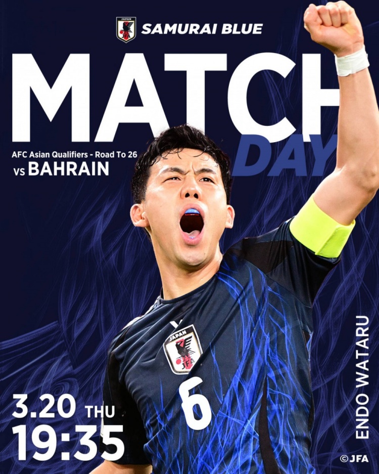 今日日本國家隊官推公布了本場比賽的海報,隊長遠藤航獨自入鏡,海報中他振臂高呼,志在為球隊帶來勝利。日本隊官推為海報配文寫道:“目標是連續(xù)出戰(zhàn)8屆世界杯,讓我們朝著這個目標,與藍武士并肩作戰(zhàn)吧!”